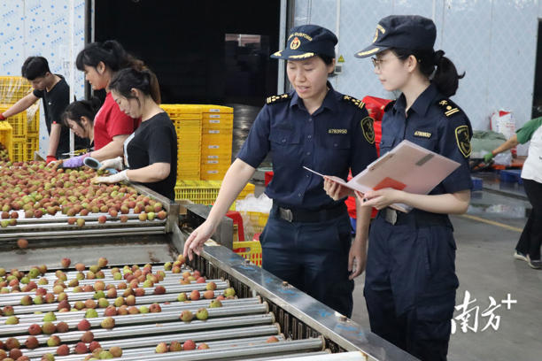 茂名荔枝出口企业基地,工人在生产线上分拣荔枝,茂名海关关员现场监管检疫。
