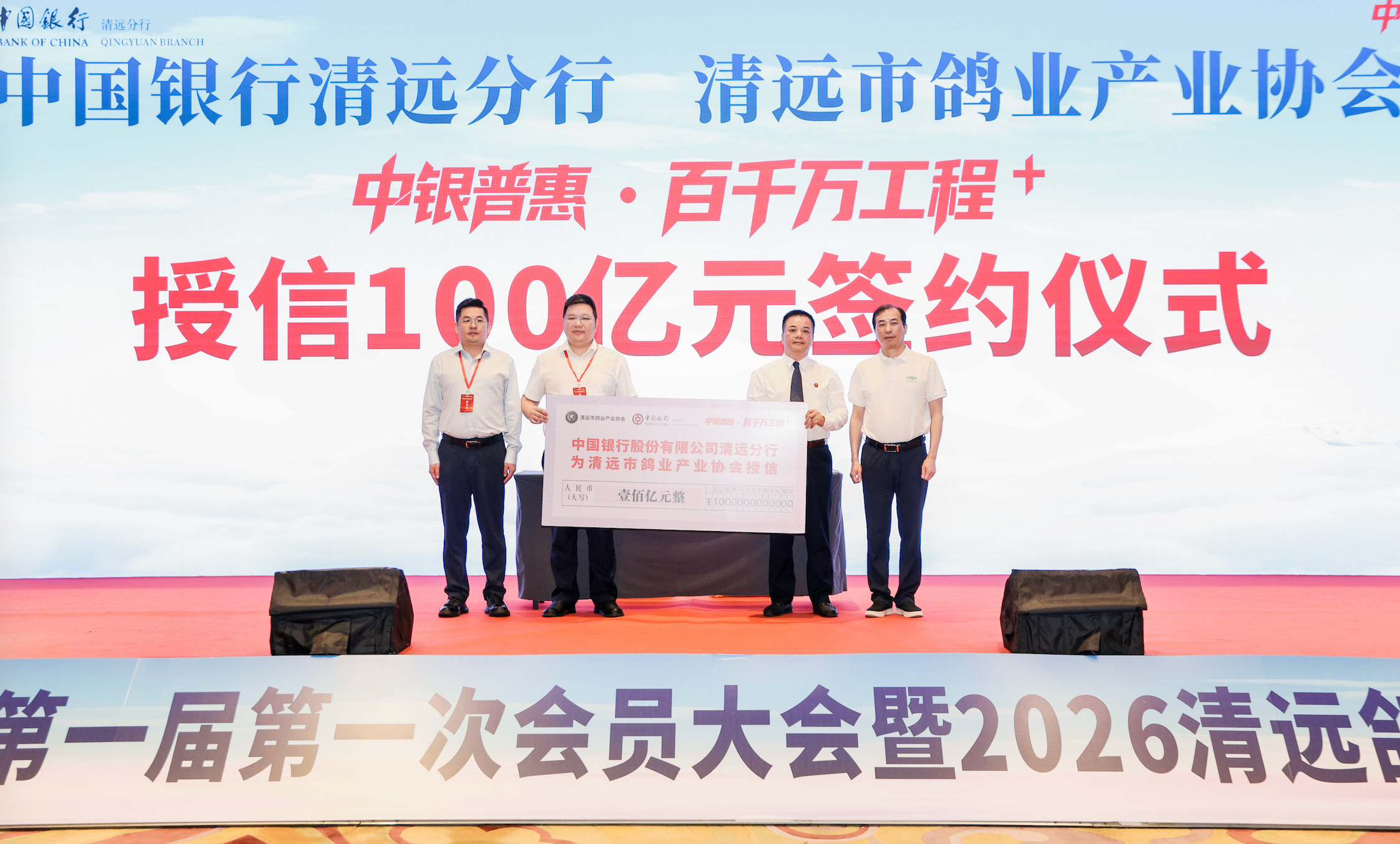 春潮涌动北江岸,鸽业腾飞正当时。4月26日,清远市鸽业产业协会第一届第一次会员大会暨2026清远鸽高质量发展推进会在清远举行。会上,中国银行清远分行向协会整体授信100亿元,两个重点产业链项目同步签约,标志着清远鸽产业正式吹响打造百亿级产业集群的冲锋号,为 "天下食材清远好" 再添一张闪亮名片。
